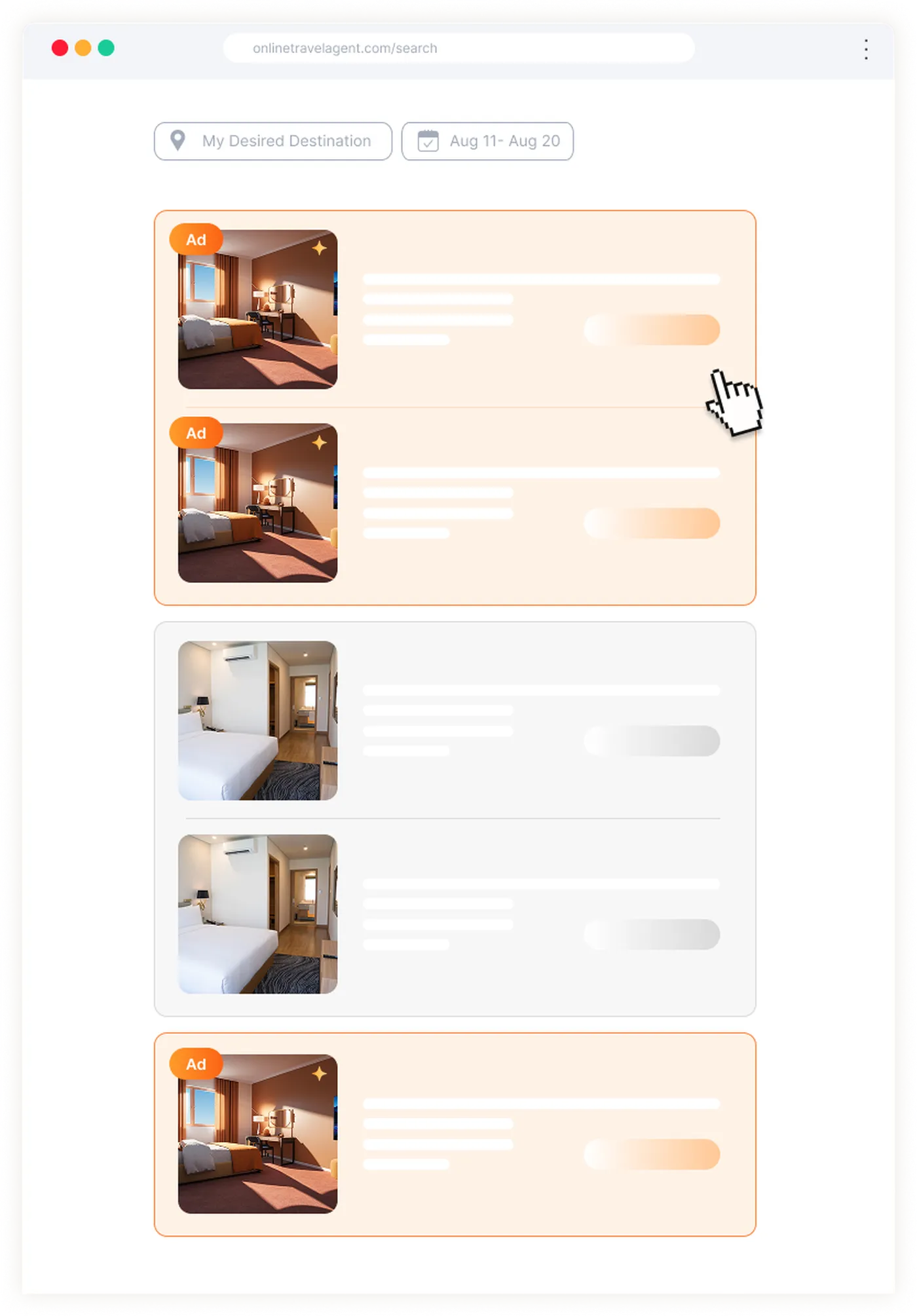 Sponsored hotel listings are listings that are promoted to stand out against organic listings, usually by appearing higher on the page with attractive messaging, or placed in strategic locations in a search-page where shoppers are known to convert at a higher rate.