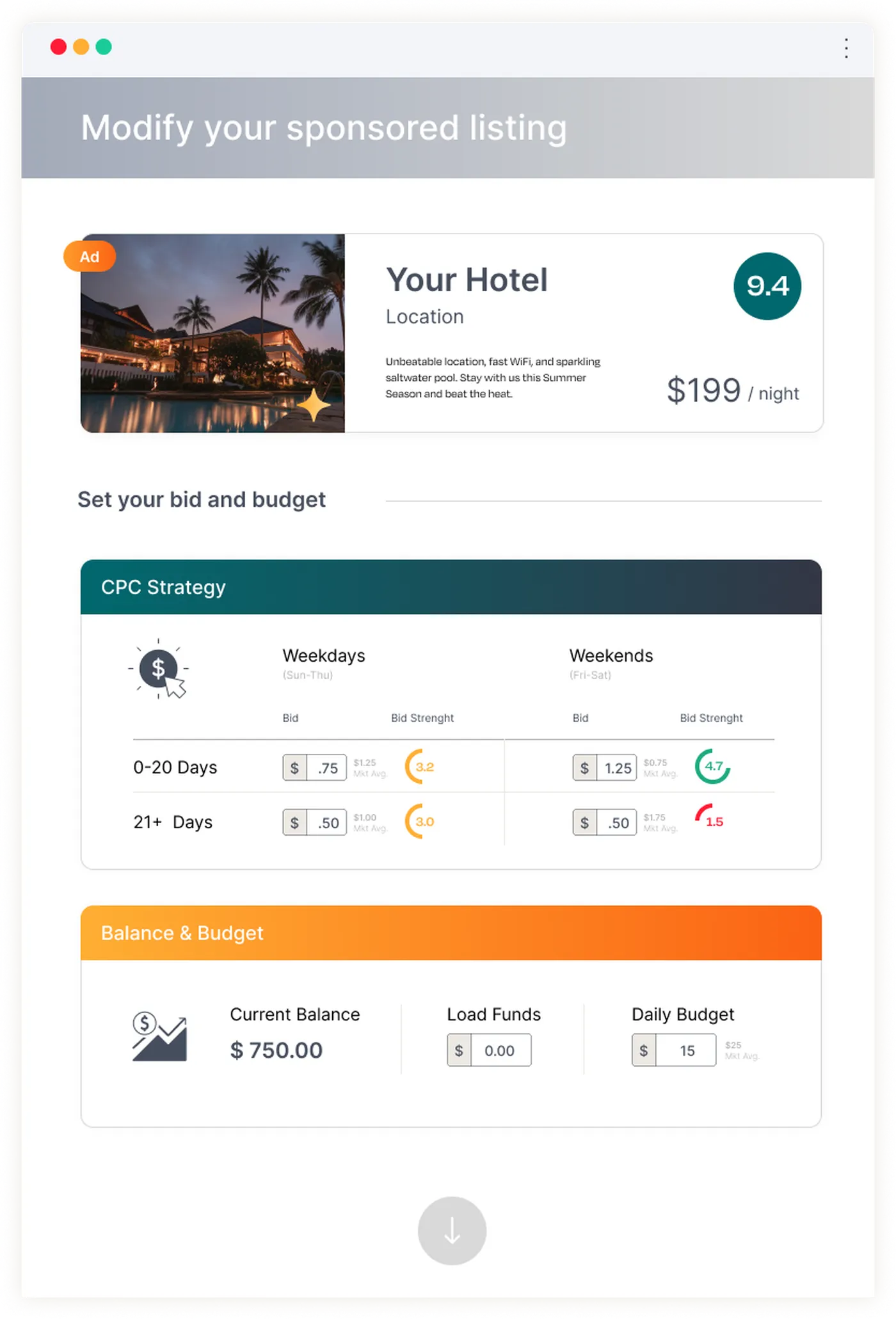 Your budget is how much you are willing to spend on clicks. Often, hoteliers will set a daily, weekly, or monthly budget to ensure that they aren’t spending an excessive amount on sponsored listings.