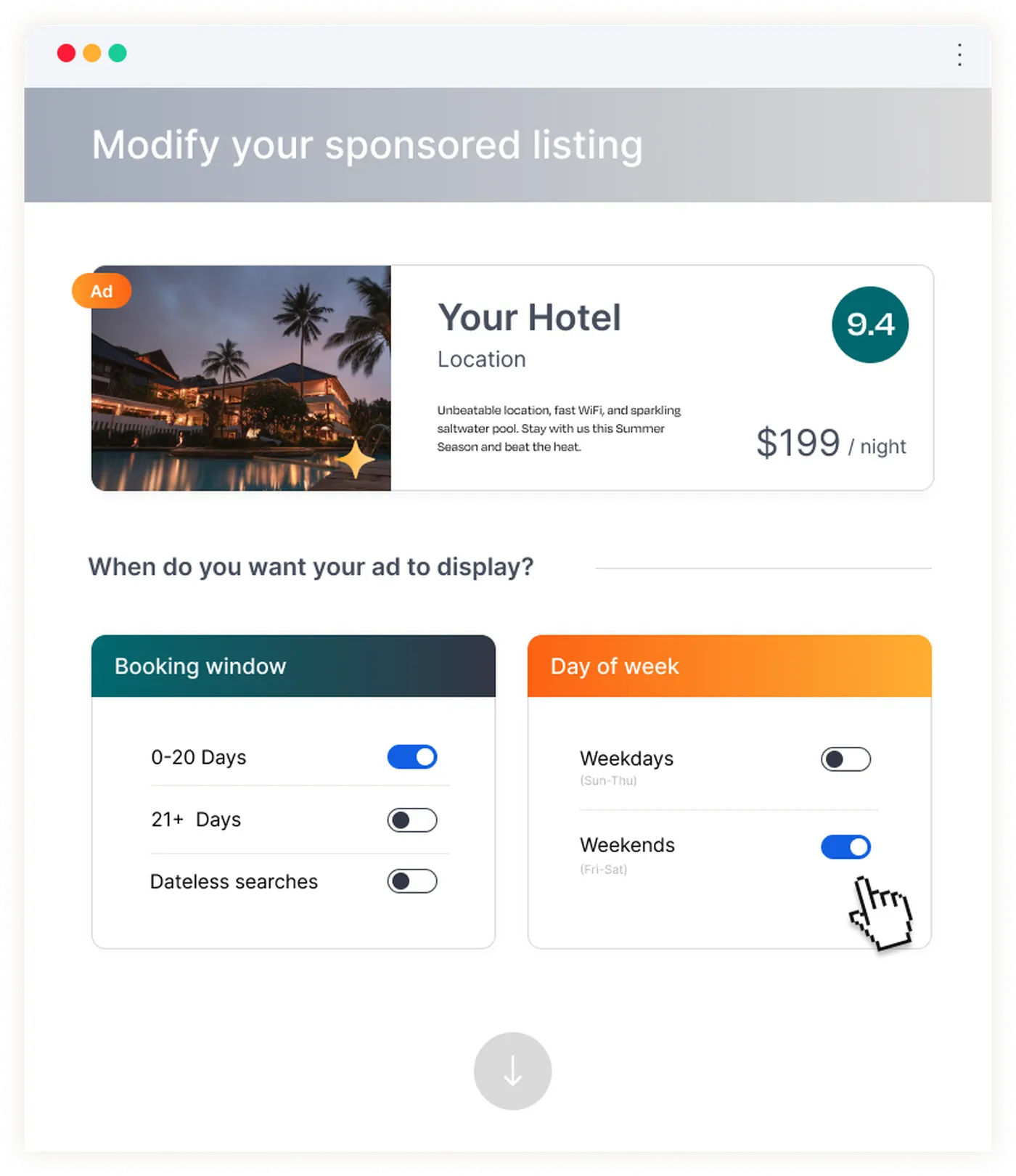 For example, you may only want your sponsored listing to show to last-minute weekend travelers, in this case you would opt to only show the sponsored listing to shoppers booking in that time frame, along with only showing the ad to shoppers shopping for weekend stays.